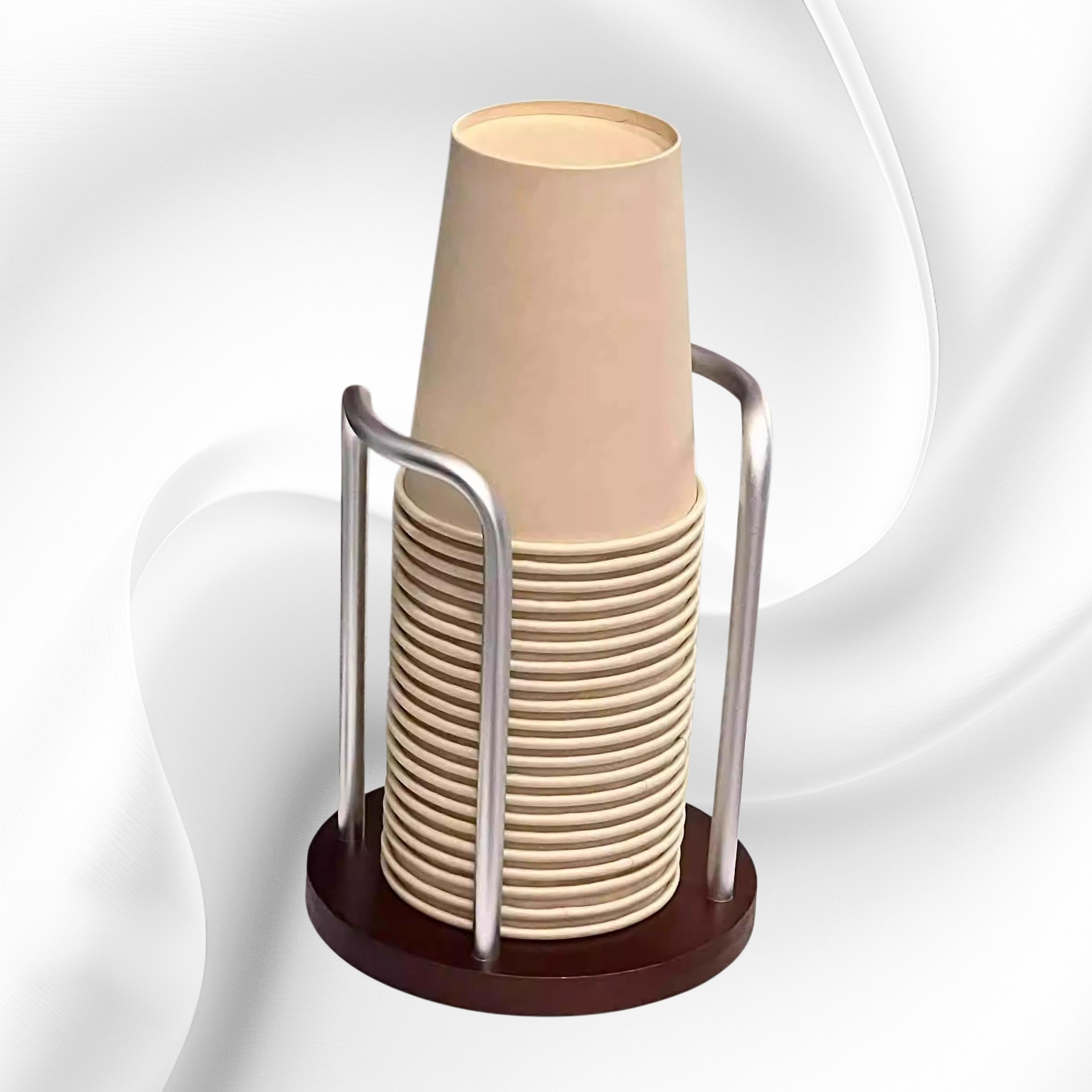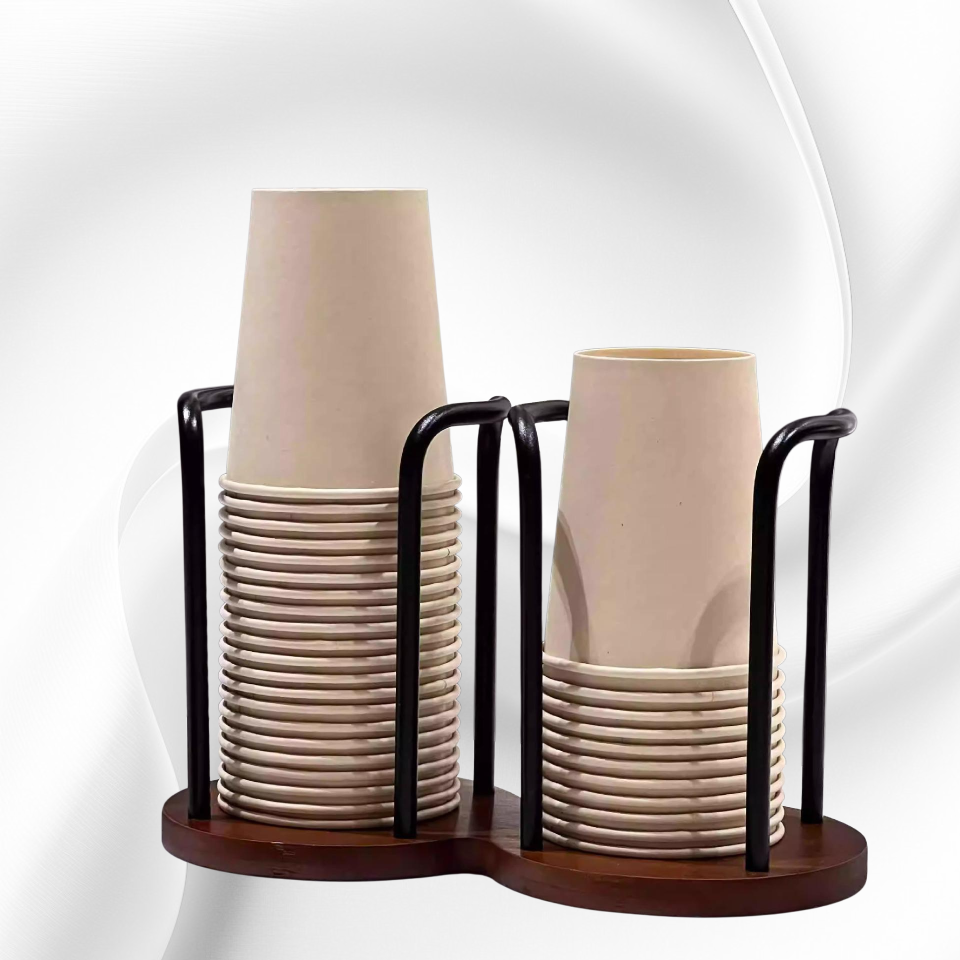Dřevěný dávkovač kelímků do kanceláře, multifunkční stojan na kelímky, šetří místo, snadné doplňování, odolný materiál, vhodný na různé velikosti kelímků, elegantní design pro kancelář.